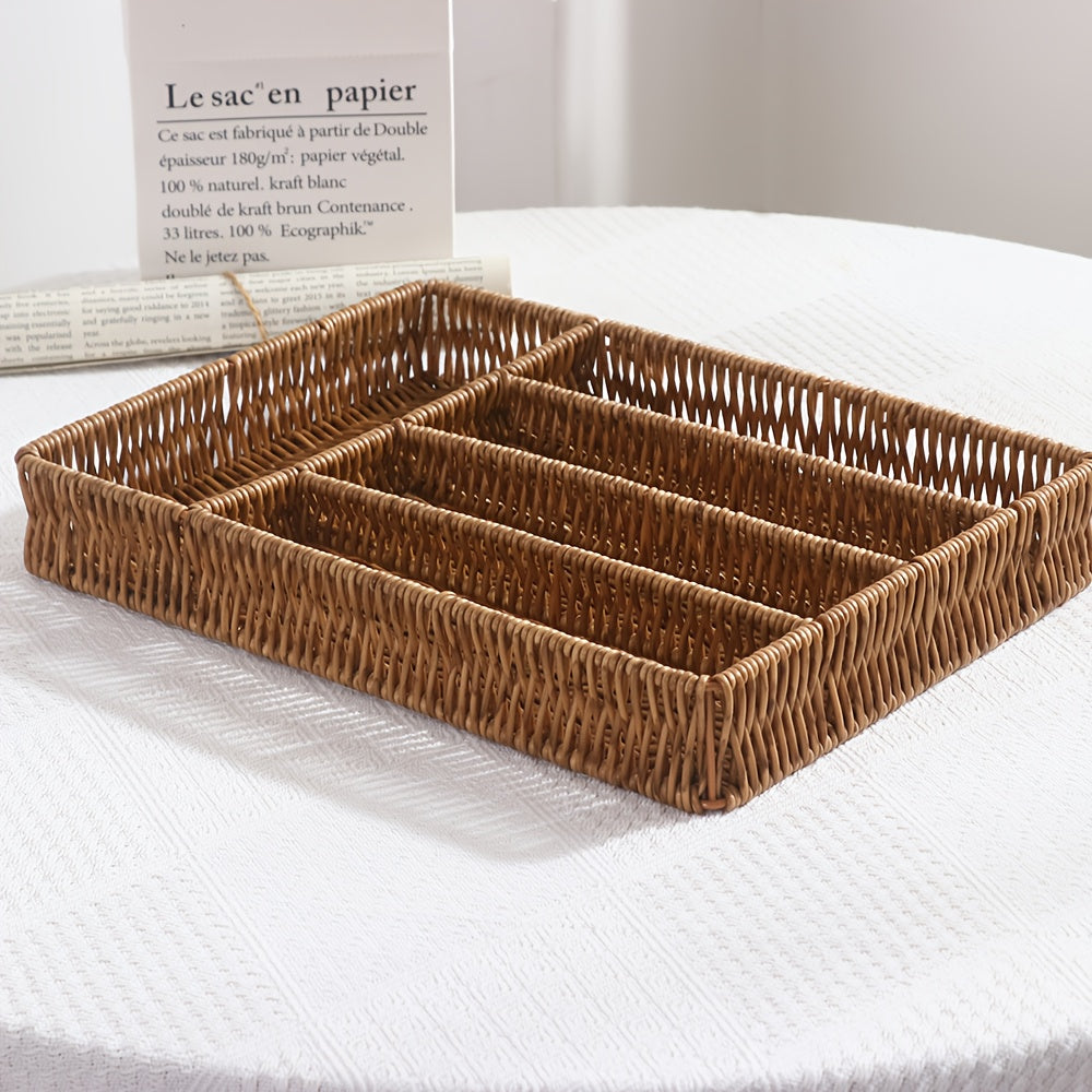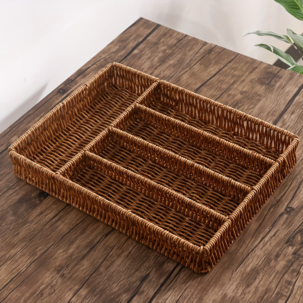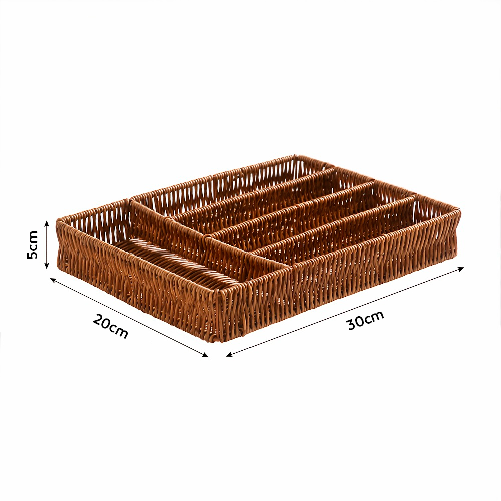 Mantén tu cocina ordenada y elegante con este práctico organizador de cubiertos hecho de ratán sintético de alta calidad. Su diseño con 5 compartimentos te permite separar cuchillos, tenedores, cucharas, palillos y otros utensilios, evitando el desorden en tus cajones o sobre la mesa.