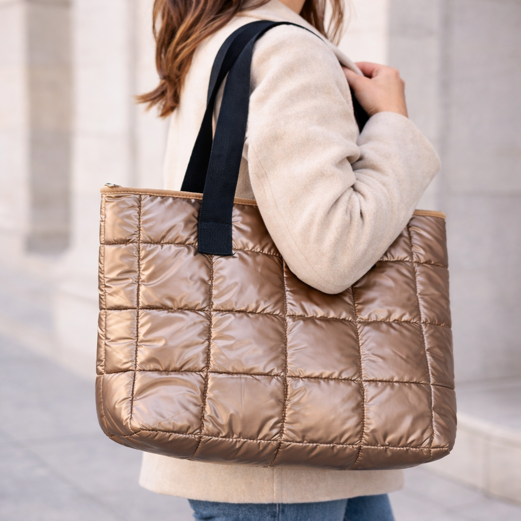 Bolso tipo tote confeccionado en material acolchado de acabado brillante, ideal para un look moderno y urbano. Su diseño ligero pero espacioso lo convierte en el complemento perfecto para el uso diario, trabajo, compras o salidas casuales.