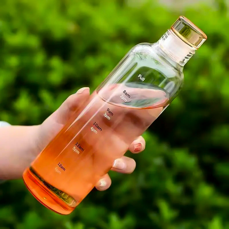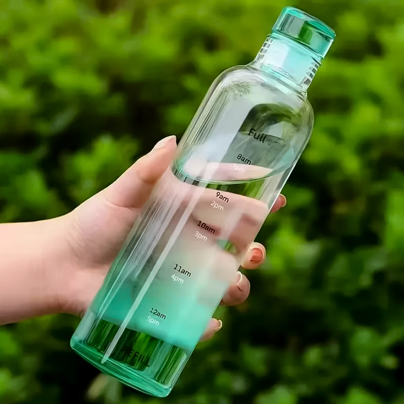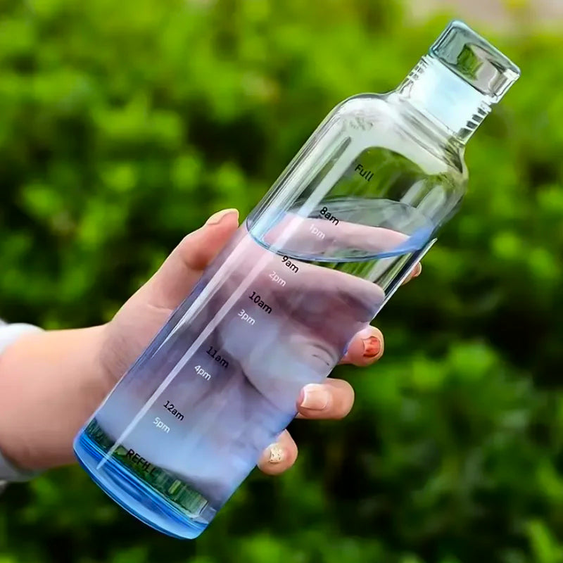Mantén tu hidratación bajo control con elegancia. Esta botella de vidrio (o acrílico de alta calidad) es el accesorio perfecto para quienes buscan un estilo de vida saludable sin sacrificar la estética. Su diseño totalmente transparente no solo es moderno, sino que te permite ver exactamente cuánto has avanzado en el día.