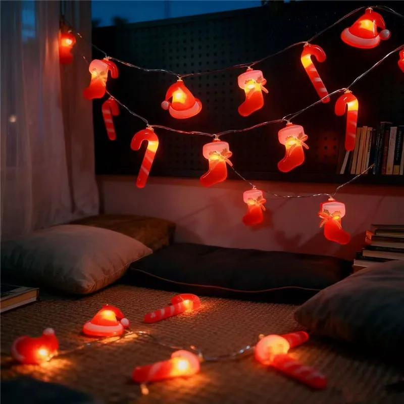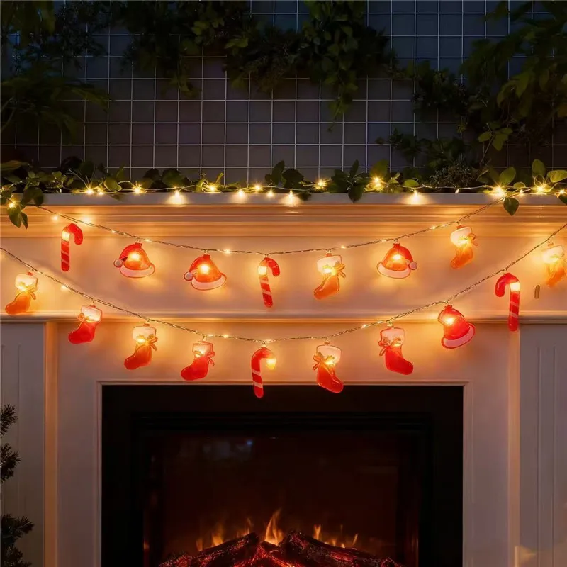 Ilumina tu hogar con el encanto y la calidez de la Navidad con esta guirnalda de luces decorativas en forma de gorros, bastones, botas y campanas. Perfecta para decorar tu sala, chimenea, árbol o ventanas, creando un ambiente festivo y acogedor.