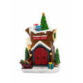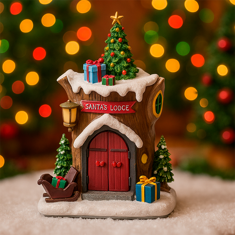 La villa navideña Santa’s Lodge recrea la acogedora cabaña de Papá Noel, rodeada de nieve, regalos y árboles decorados. Su cálida iluminación y diseño detallado la convierten en una pieza perfecta para realzar tu decoración navideña.