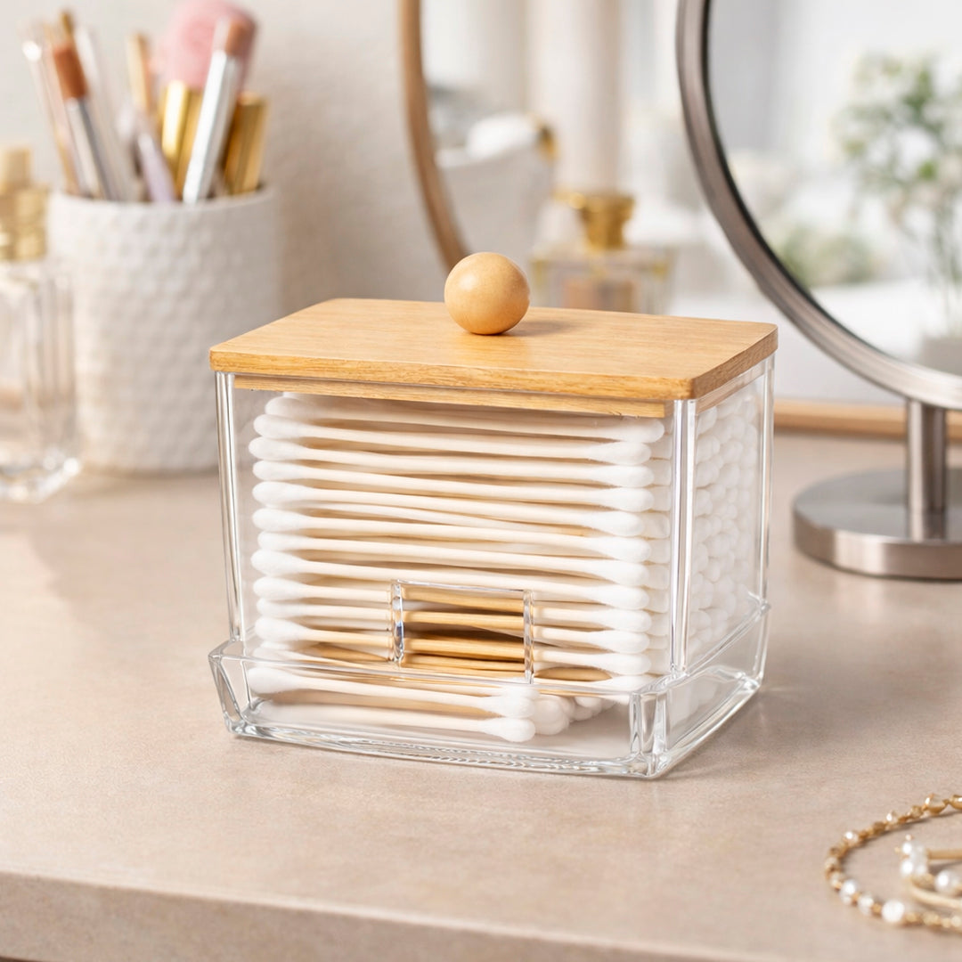 🧴 Dispensador de Hisopos de Acrílico con Tapa de Bambú