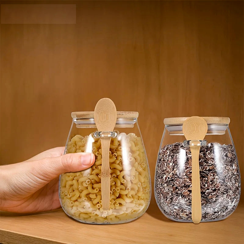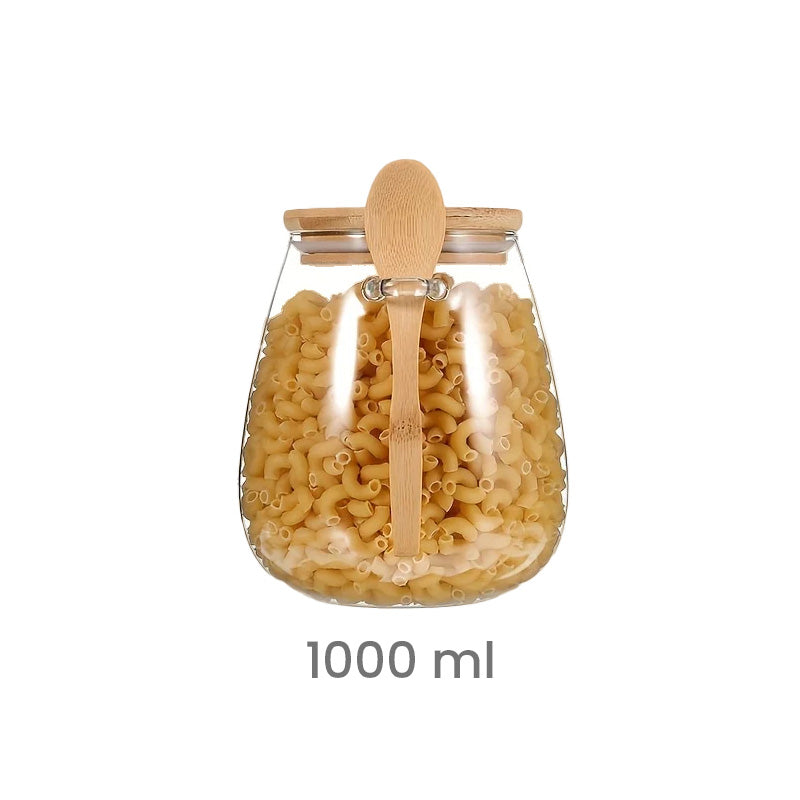 Frasco de vidrio transparente con tapa de bambú y cuchara integrada, perfecto para almacenar y organizar alimentos secos de forma práctica y elegante 🤍. Su diseño minimalista y natural lo convierte en un complemento ideal para cocinas modernas, nórdicas o ecológicas.