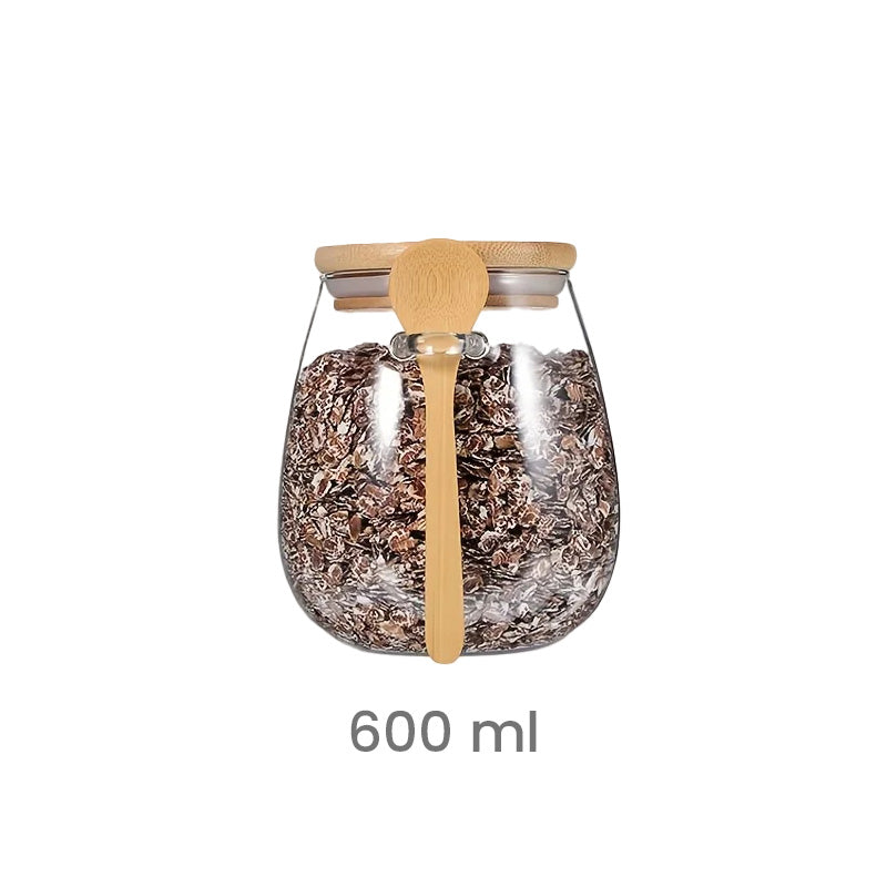 Fabricado en vidrio resistente, permite visualizar fácilmente el contenido, mientras que la tapa de bambú ayuda a conservar los alimentos frescos 🍃. La cuchara incorporada facilita el uso diario, aportando comodidad y orden.