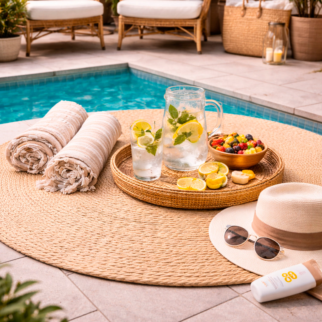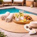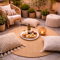 Su diámetro de 80 cm la hace perfecta para múltiples usos: como alfombra decorativa en interiores, zona de descanso en terrazas o azoteas, rincones boho, áreas junto a la piscina o incluso como elemento decorativo en tiendas y espacios comerciales.