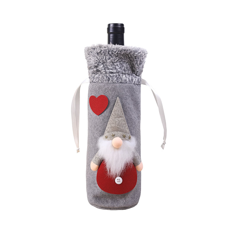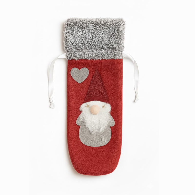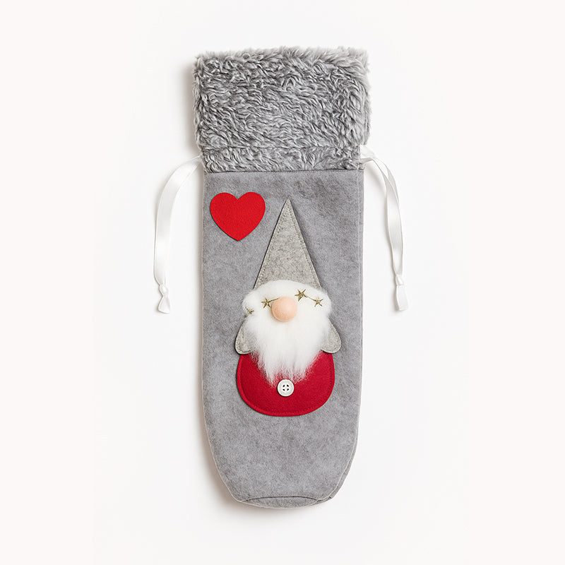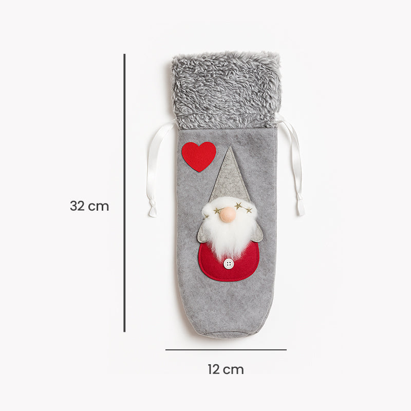 Haz que tus obsequios destaquen esta Navidad con esta encantadora cubierta para vino con diseño de duende, elaborada en suave tela gris y decorada con detalles cálidos y festivos. Su confección combina fieltro de alta calidad, peluche tipo borreguillo en la parte superior y un adorable duende navideño con barba esponjosa, nariz de madera y apliques en forma de estrellas y corazón.