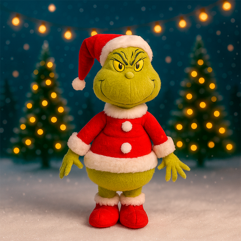 Este peluche del Grinch con traje de Santa Claus es perfecto para quienes disfrutan el lado divertido y diferente de las fiestas. Su expresión característica y su suave textura lo convierten en una pieza única para decorar o regalar.