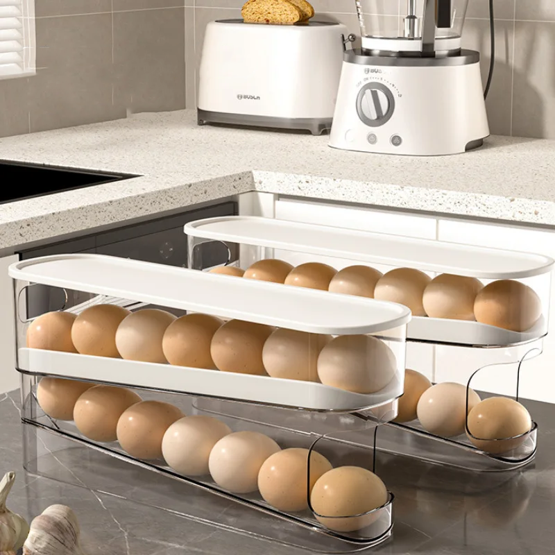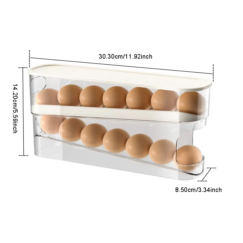 Mantén tu cocina y refrigerador siempre ordenados con este práctico organizador de huevos. Su diseño inteligente permite que los huevos se deslicen automáticamente hacia adelante, asegurando que siempre uses primero los más antiguos.