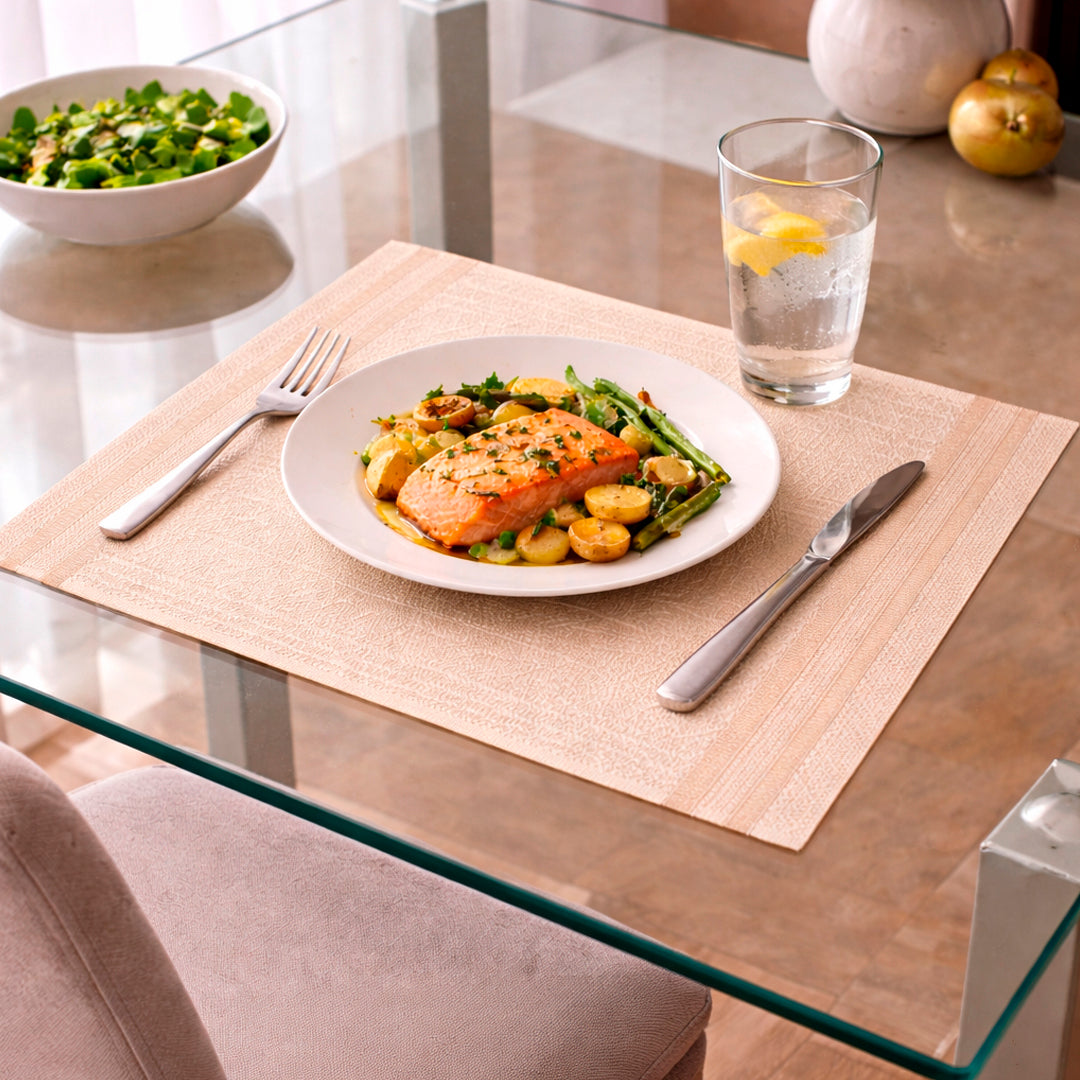 Fabricado en material resistente y fácil de limpiar, este individual protege la superficie de la mesa del calor, manchas y rayones, manteniendo siempre una apariencia impecable. Su acabado ligeramente satinado realza la iluminación del ambiente y combina perfectamente con vajilla blanca, cubiertos metálicos y mesas de madera o vidrio.