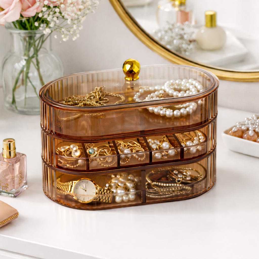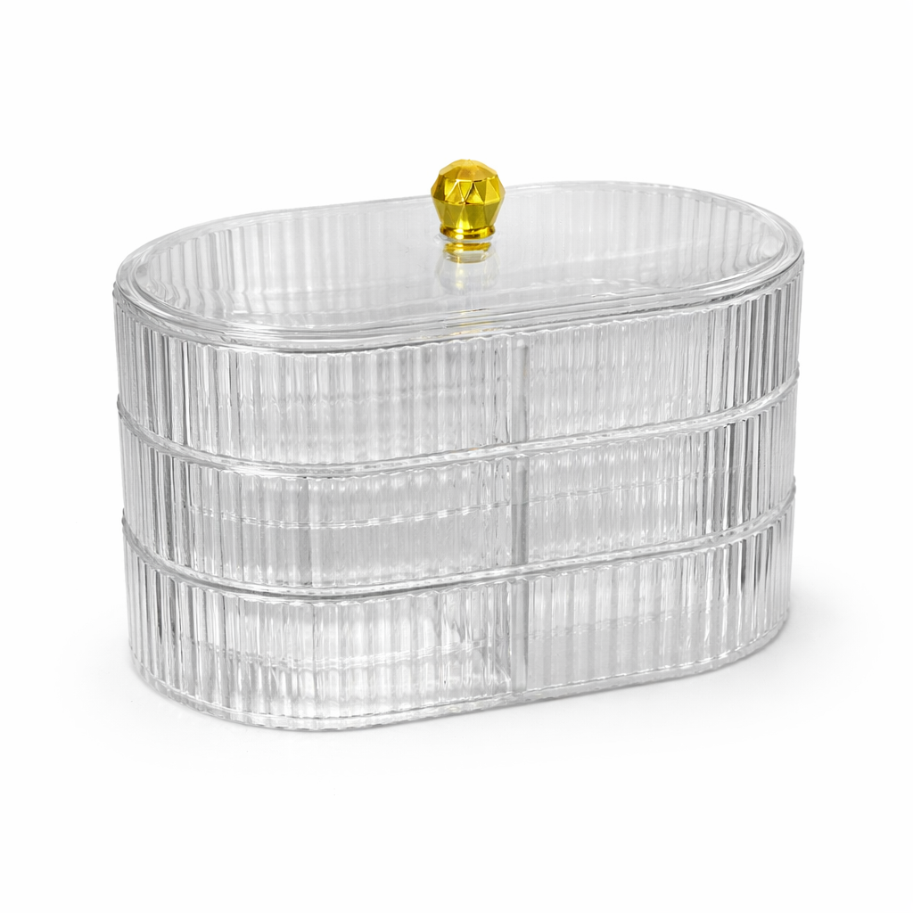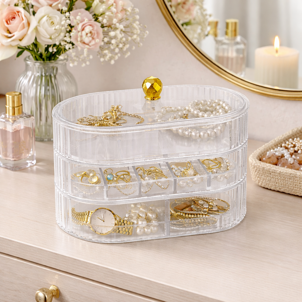 Organiza y protege tus accesorios con este elegante joyero de tres niveles, diseñado para mantener tus joyas siempre visibles, ordenadas y fáciles de encontrar. Su diseño moderno y funcional lo convierte en el complemento perfecto para tu tocador, cómoda o escritorio.