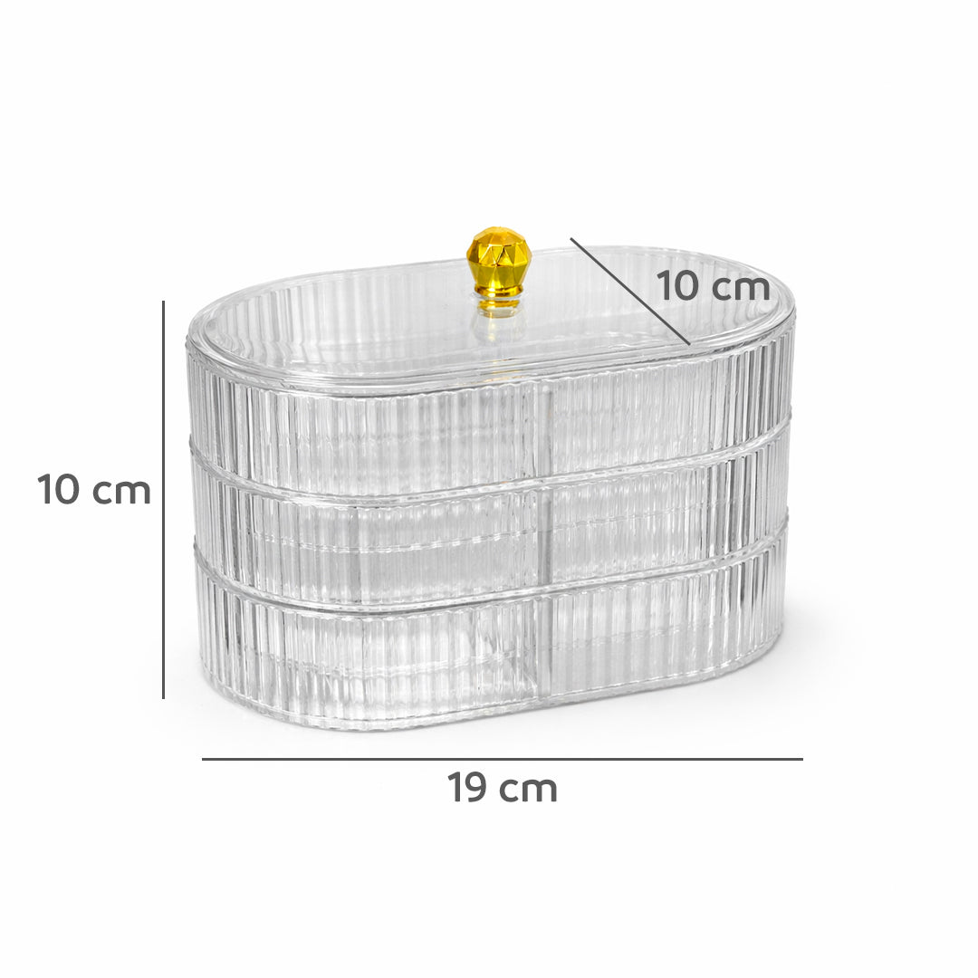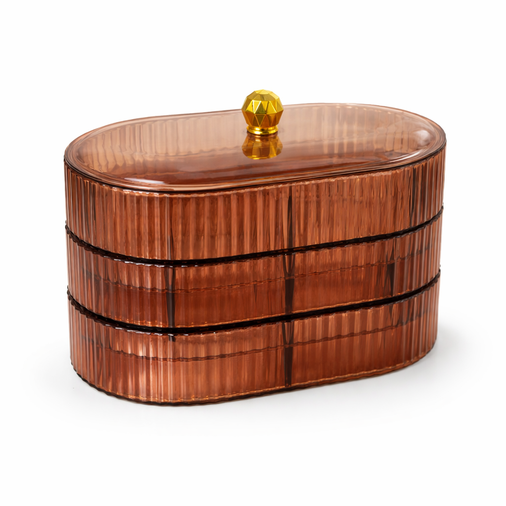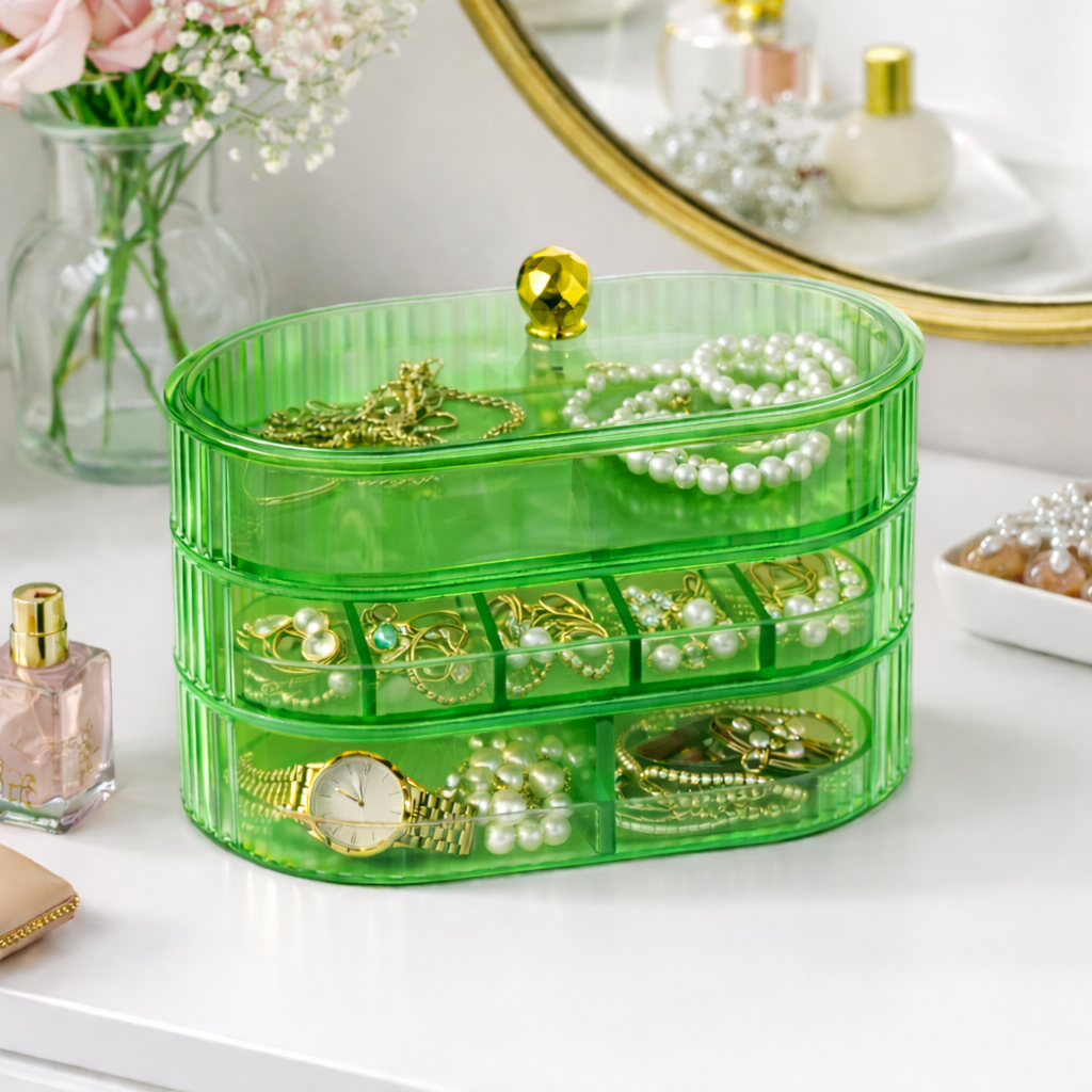 Organiza y protege tus accesorios con este elegante joyero de tres niveles, diseñado para mantener tus joyas siempre visibles, ordenadas y fáciles de encontrar. Su diseño moderno y funcional lo convierte en el complemento perfecto para tu tocador, cómoda o escritorio.