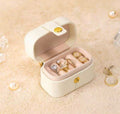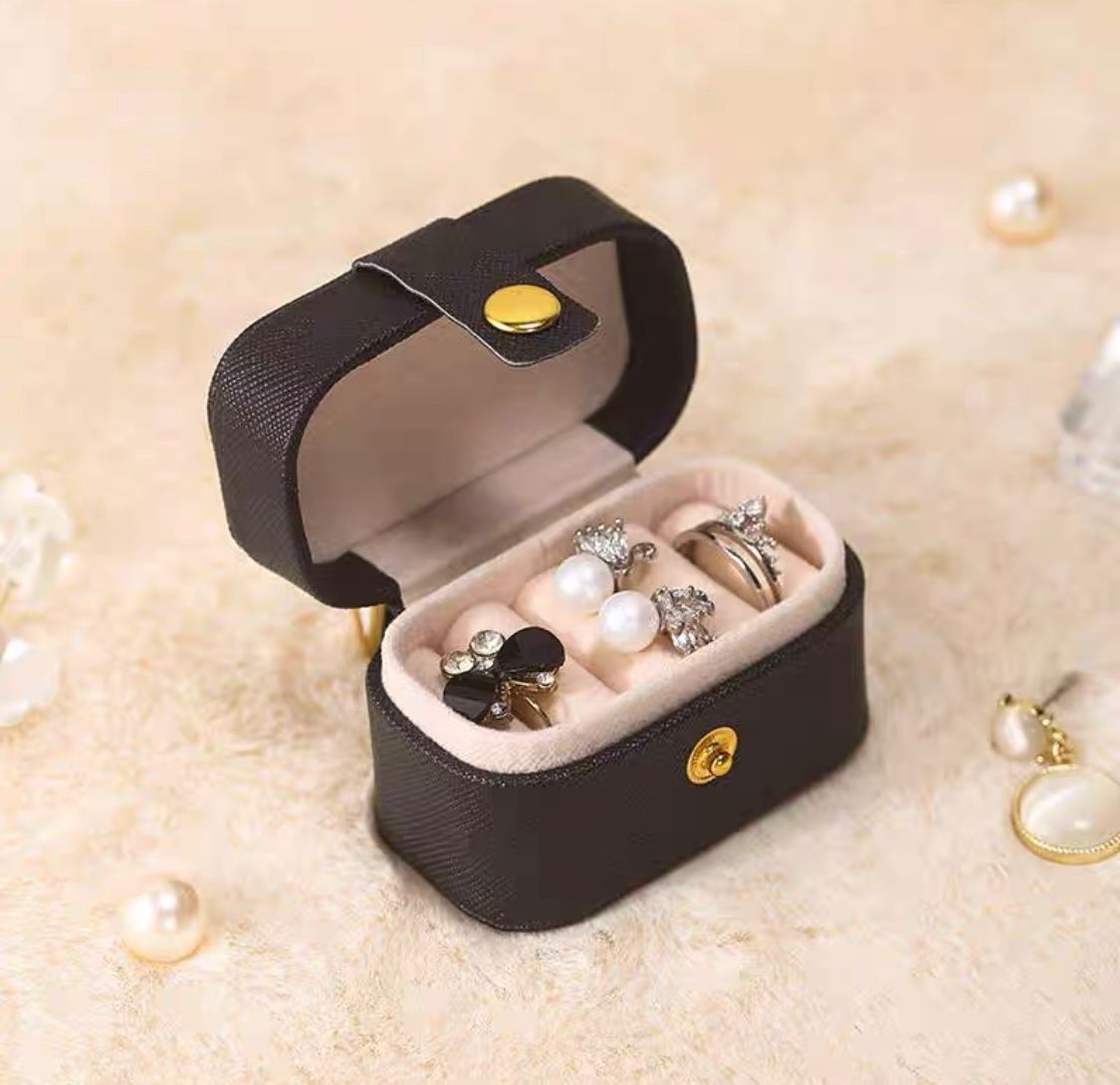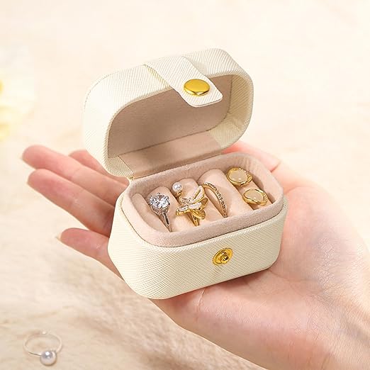 La caja de joyería es de tamaño pequeño para uso portátil esencial de belleza. El rollo de 5 anillos puede fijar bien tus anillos o pendientes. Con este mini estuche de joyería, ya no te preocupes por que los anillos o aretes se pierdan mientras viajas.