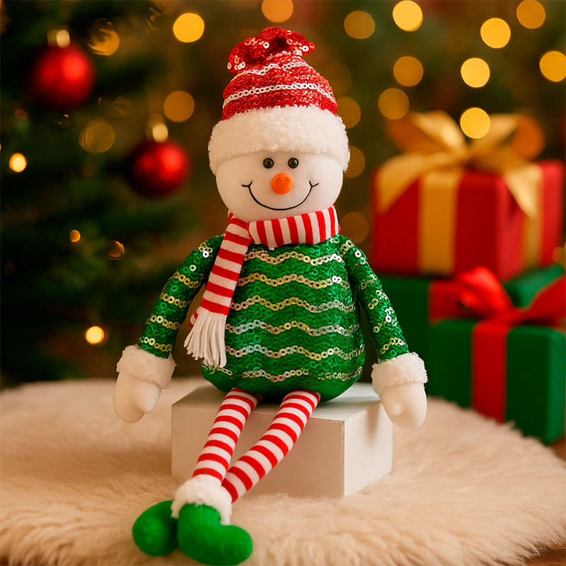 Llena tu hogar de alegría con este adorable muñeco de nieve navideño, vestido con un suéter verde de lentejuelas que brilla con las luces del árbol. Su bufanda y gorrito rojo con blanco, junto con sus piernas largas a rayas, le dan un toque tierno y divertido a cualquier rincón.