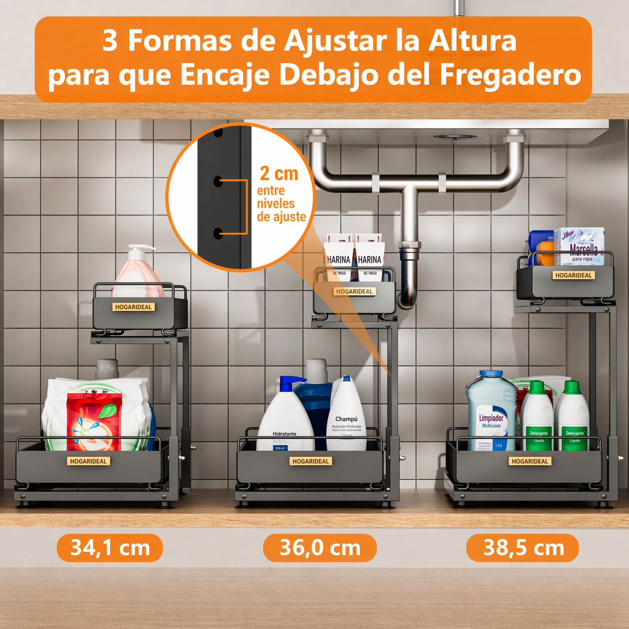 Diseñado con altura ajustable y bandejas deslizables, te permite organizar productos de limpieza, botellas, cajas y más de forma práctica y accesible.