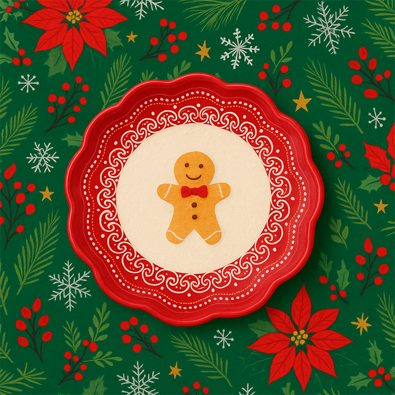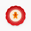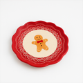 Este encantador plato navideño con diseño de muñeco de jengibre es perfecto para servir galletas, postres o bocaditos durante las celebraciones. Su borde rojo con detalles blancos aporta ese toque clásico y alegre que no puede faltar en tu decoración navideña.