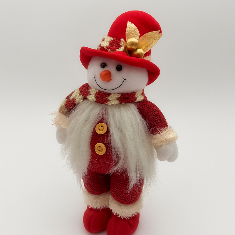 Este adorable muñeco de nieve decorativo vestirá tus espacios con alegría y espíritu navideño. Con su sombrero rojo con detalles dorados, bufanda tejida y abrigo con botones, es perfecto para colocar sobre mesas, repisas o al pie del árbol.