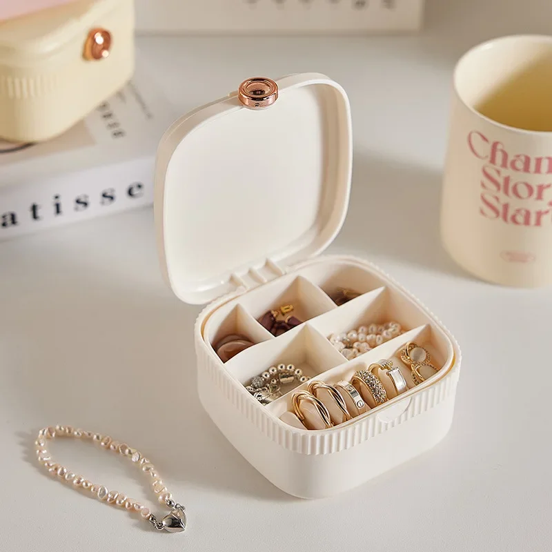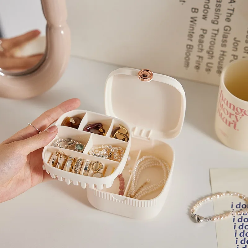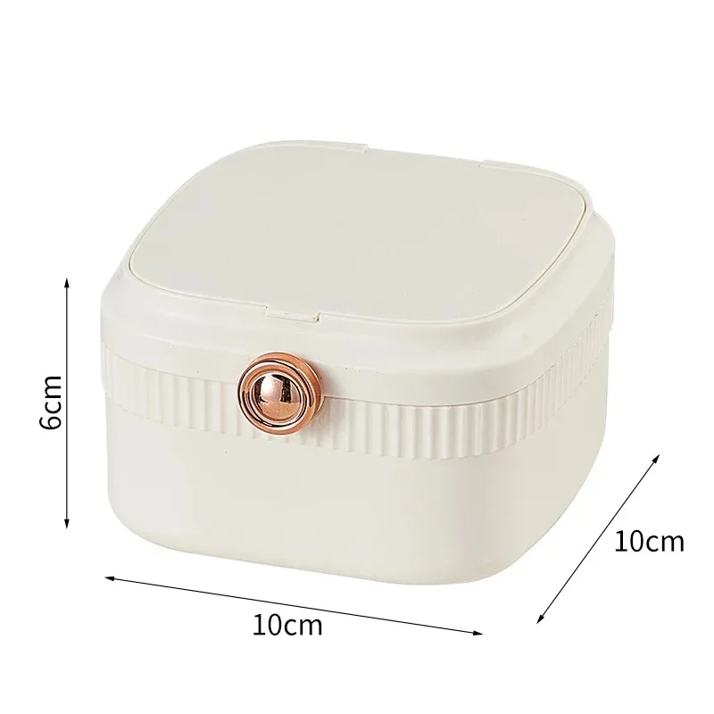 Este mini joyero compacto es perfecto para mantener tus anillos, aretes, collares y pulseras siempre ordenados. Su diseño elegante y moderno incluye compartimentos internos desmontables y un espejo integrado, ideal para llevar de viaje o mantener en tu tocador.