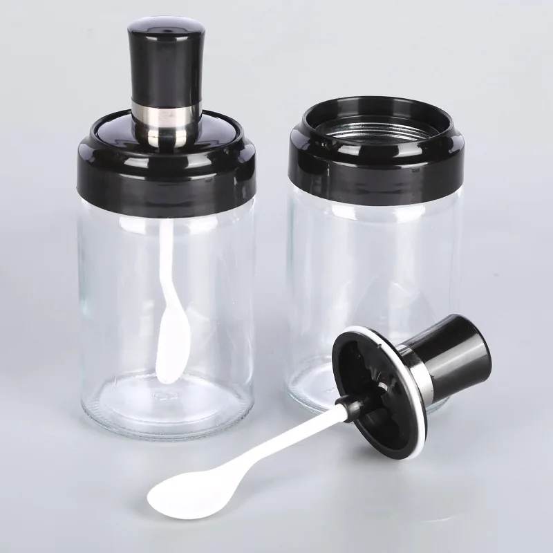 2 frascos transparentes con tapa hermética y cuchara integrada, ideales para azúcar, sal, especias o café.