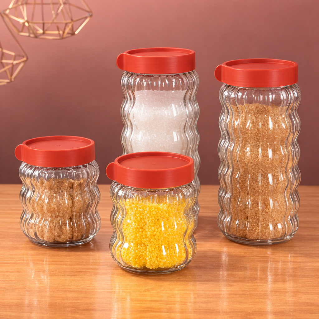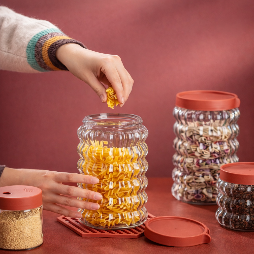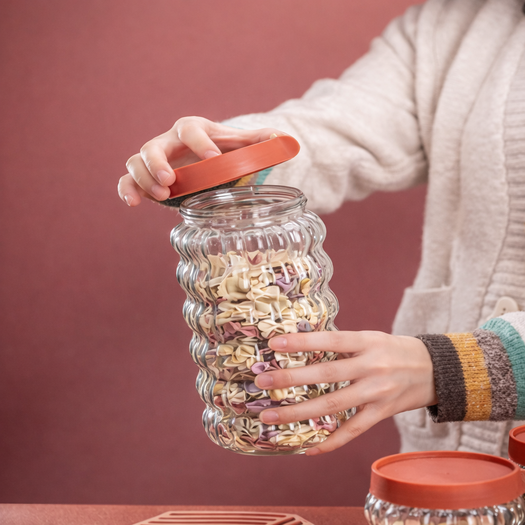 Organiza tu cocina con estilo y funcionalidad con este elegante set de frascos de vidrio diseñado para almacenar granos, azúcar, sal, cereales, frutos secos y más. Su diseño moderno y texturizado no solo conserva mejor los alimentos, sino que también aporta un toque decorativo a tu cocina.
