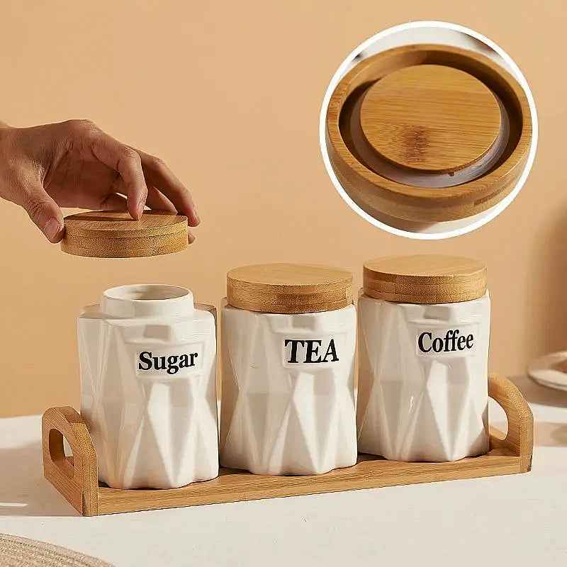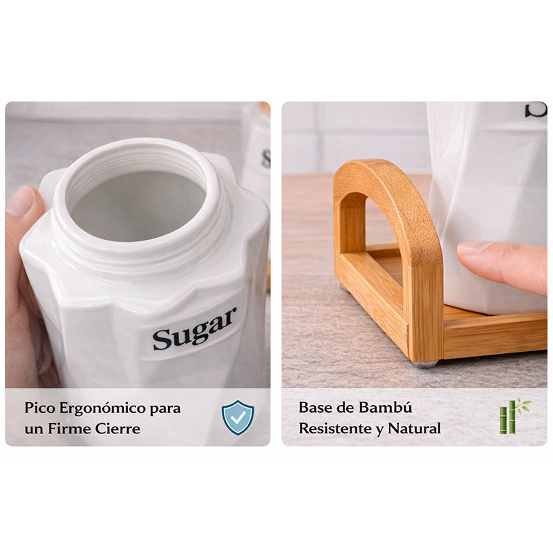 Fabricados en cerámica blanca de alta calidad con un delicado acabado facetado, cada frasco cuenta con una tapa de bambú natural que ayuda a conservar la frescura del contenido. El set incluye una base de madera que aporta estabilidad y un estilo nórdico moderno, perfecto para cocinas contemporáneas, vintage o minimalistas.