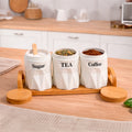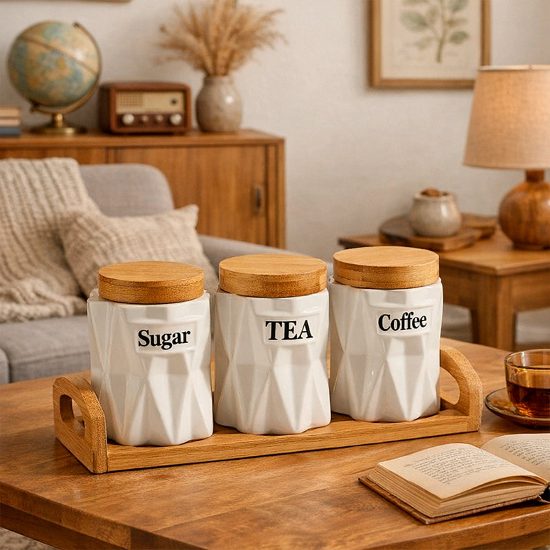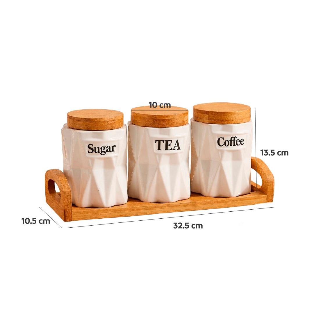 Los rótulos “Sugar”, “Tea” y “Coffee” aportan un toque clásico y sofisticado, haciendo de este set una pieza funcional y decorativa a la vez.