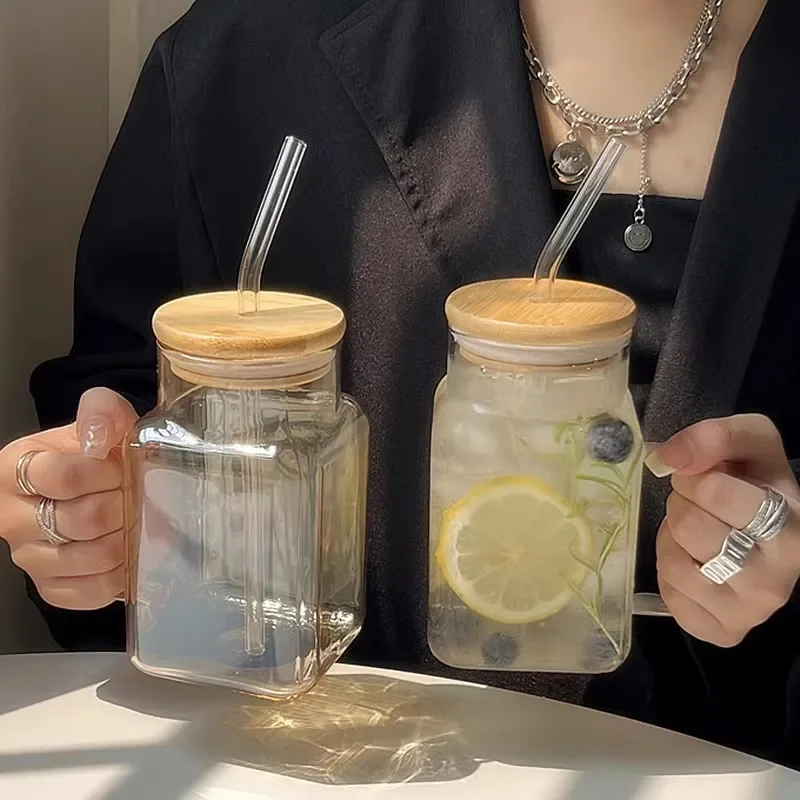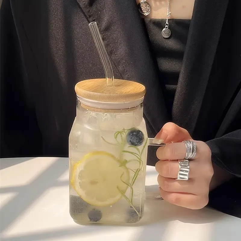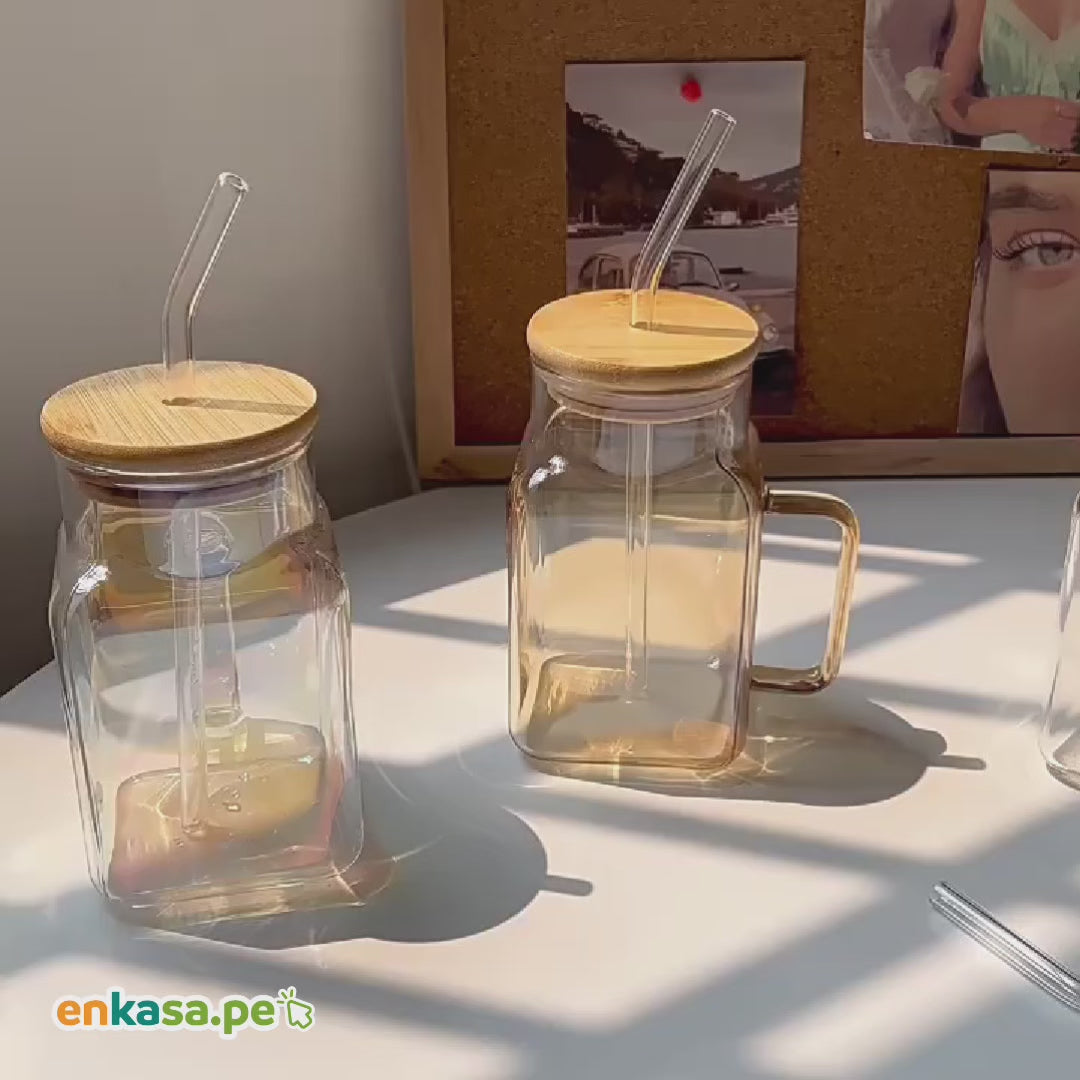 🥤 Vaso de vidrio con tapa de bambú y cañita – 550 ml