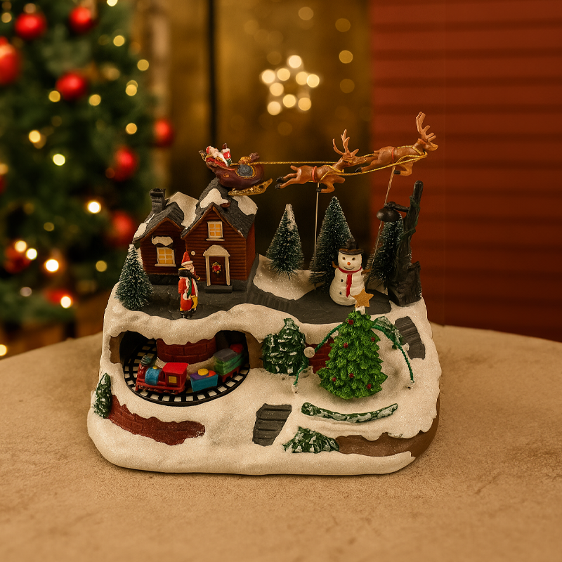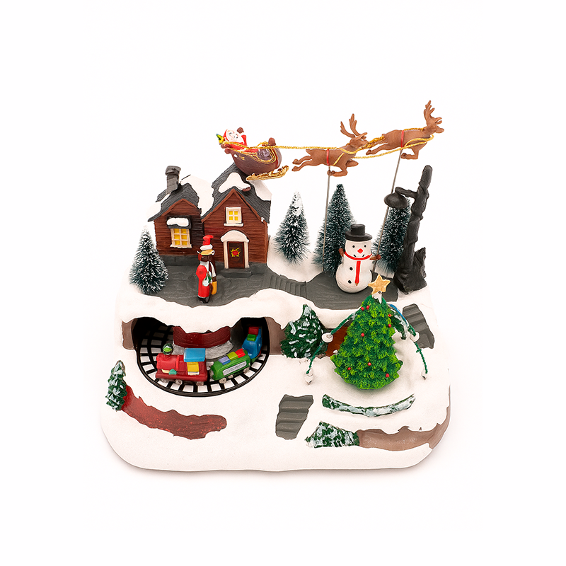Esta hermosa villa navideña animada combina luces cálidas, movimiento y un encantador diseño que llenará tu hogar de espíritu navideño. Incluye una acogedora casa nevada, un muñeco de nieve, un tren en movimiento y a Santa volando en su trineo con sus renos.